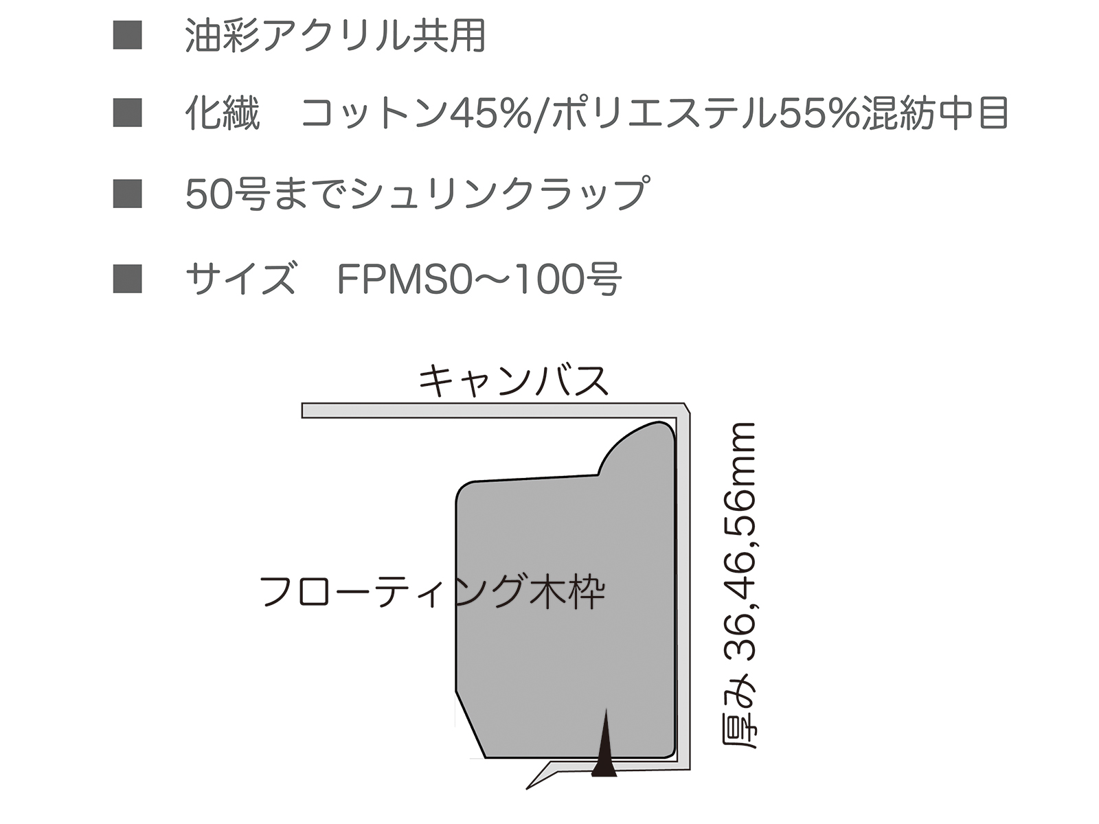 <日本サイズ0〜100号FPMS> フローティング木枠厚み36-56mm裏トメ化繊綿混紡中目キャンバス