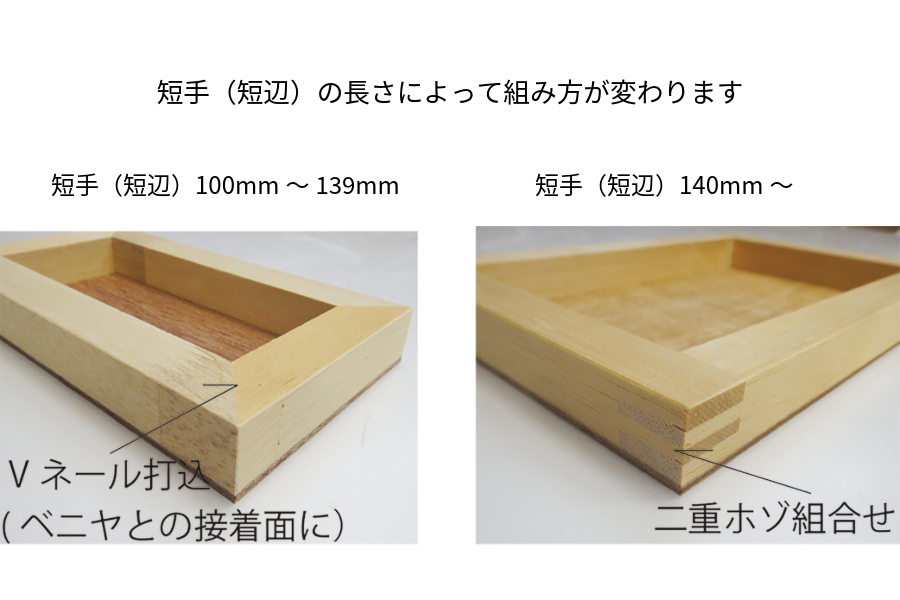 一般的木製パネルですが、枠部分の組み方が2重ホゾ構造です。これはキャンバス木枠の構造と一緒で枠のソリ曲りが最小限に抑えられる構造で、他社製品にはない最大の特徴です。(短手140mm未満はVネール組手になります)