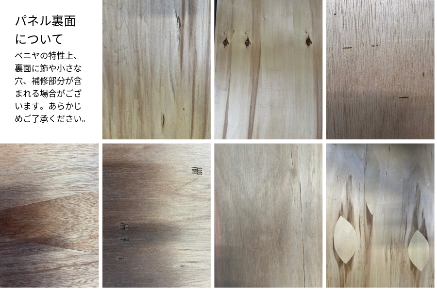 ベニヤ板は層構造の素材のため、裏面には節や小さな穴、継ぎ目を含む部分が使用される場合がございます。